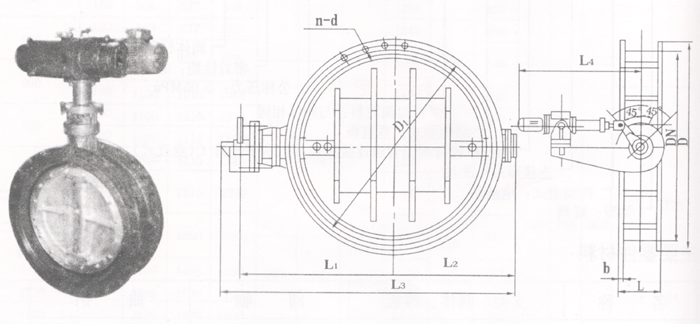 電液動蝶閥以電液推桿作動力源,通過雙向齒輪泵輪出壓力油,經(jīng)油路集成塊的控制送至油缸,實現(xiàn)活塞桿往復(fù)運動,同時通過曲柄轉(zhuǎn)動閥軸、閥板作90°范圍旋轉(zhuǎn),達(dá)到調(diào)節(jié)流量的目的。